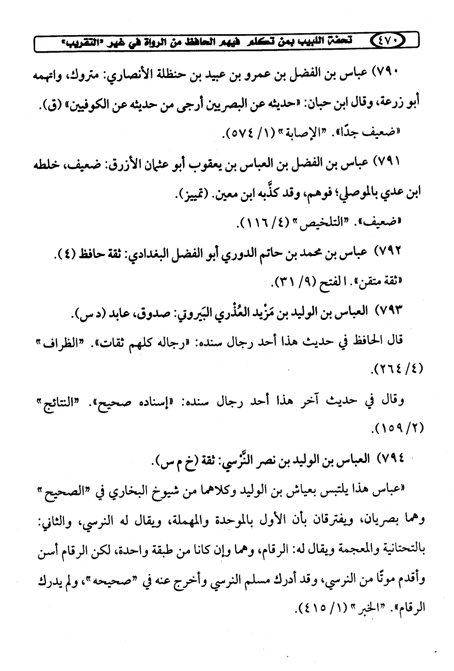 790) عباس بن الفضل بن عمرو بن عبيد بن حنظلة الأنصاري: متروك، واتهمه أبو زرعة، وقال ابن حبان: "حديثه عن البصريين أرجى من حديثه عن الكوفيين" (ق).
