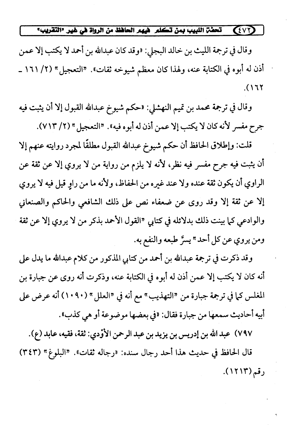 قلت: وإطلاق الحافظ أن حكم شيوخ عبد الله القبول مطلقًا لمجرد روايته عنهم إلا أن يثبت فيه جرح مفسر فيه نظر، لأنه لا يلزم من رواية من لا يروي إلا عن ثقة عن الراوي أن يكون ثقة عنده ولا عند غيره من الحفاظ، ولأنه ما من راوٍ قيل فيه لا يروي إلا عن ثقة إلا وقد روى عن ضعفاء نص على ذلك الشافعي والحاكم والصنعاني والوادعي كما بينت ذلك بدلائله في كتابي "القول الأحمد بذكر من لا يروي إلا عن ثقة ومن يروي عن كل أحد" يسرَّ طبعه والنفع به.