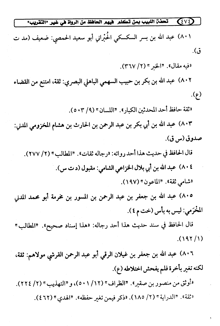 806) عبد الله بن جعفر بن غيلان الرقي أبو عبد الرحمن القرشي مولاهم: ثقة، لكنه تغير بأخرة فلم يفحش اختلاطه (ع).