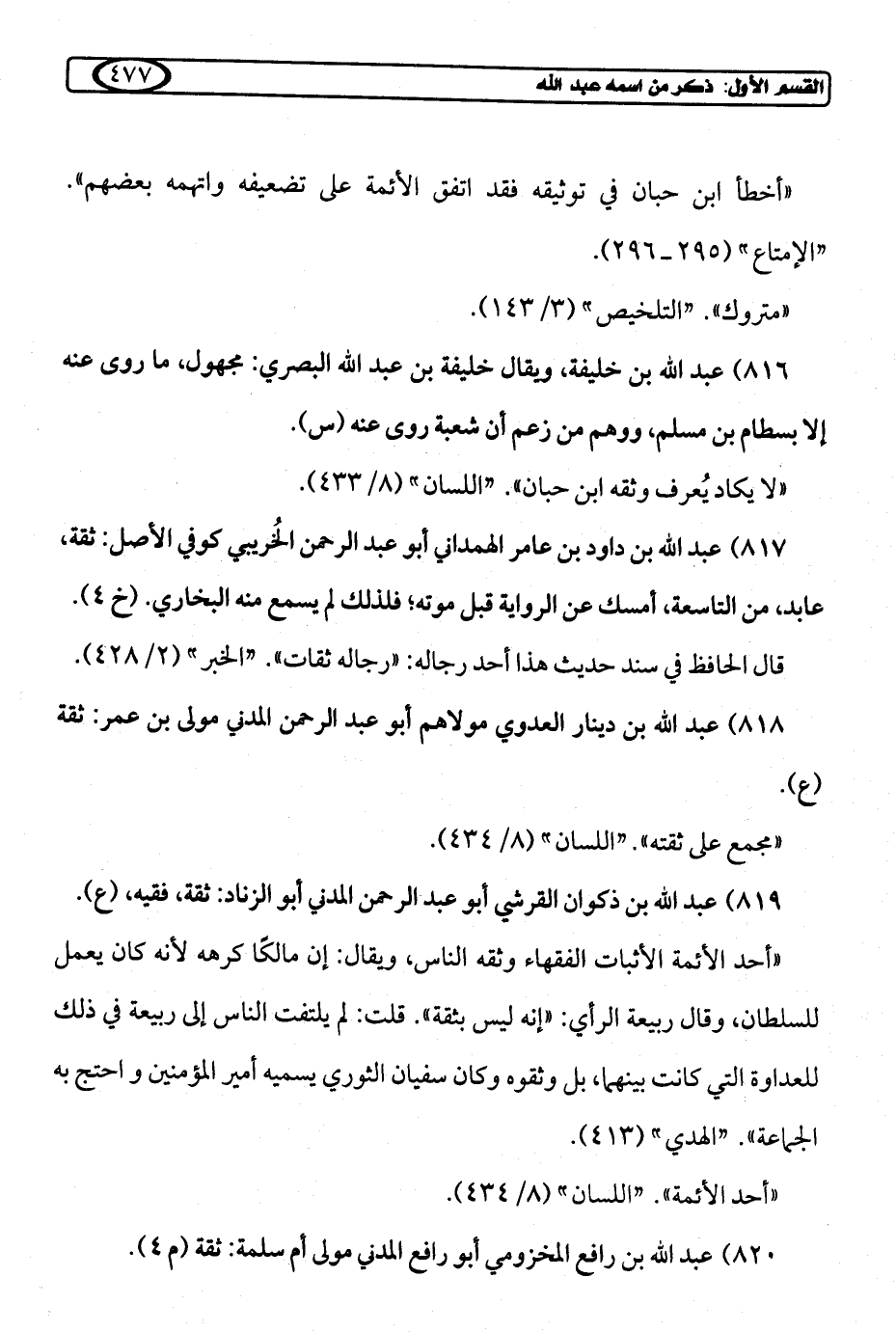 819) عبد الله بن ذكوان القرشي أبو عبد الرحمن المدني أبو الزناد: ثقة، فقيه، (ع).