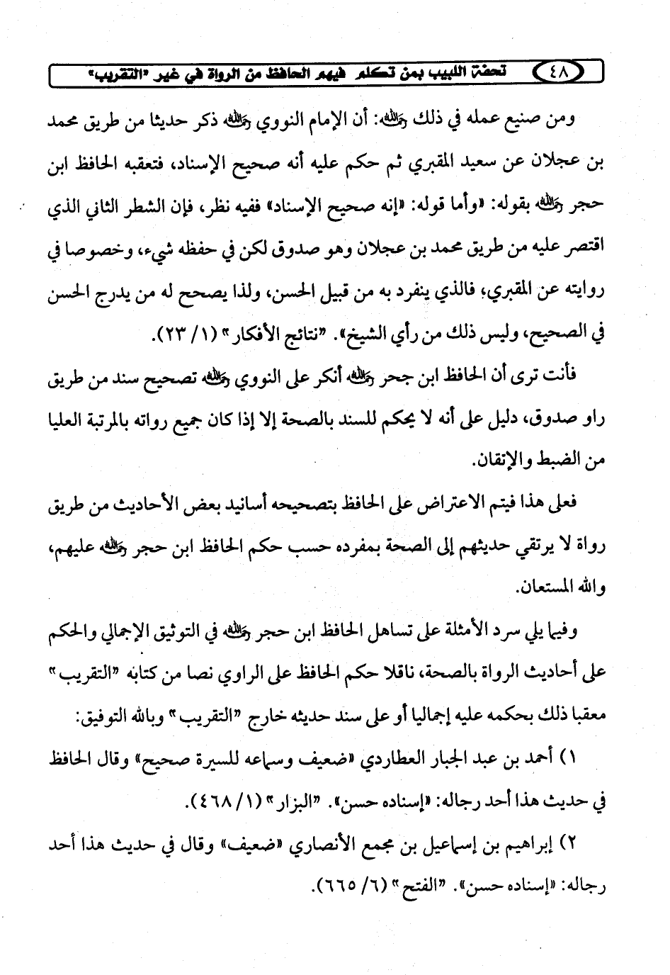 ومن صنيع عمله في ذلك رحمه الله: أن الإمام النووي رحمه الله ذكر حديثا من طريق محمد بن عجلان عن سعيد المقبري ثم حكم عليه أنه صحيح الإسناد، فتعقبه الحافظ ابن حجر رحمه الله بقوله: "وأما قوله: "إنه صحيح الإسناد" ففيه نظر، فإن الشطر الثاني الذي اقتصر عليه من طريق محمد بن عجلان وهو صدوق لكن في حفظه شيء، وخصوصا في روايته عن المقبري؛ فالذي ينفرد به من قبيل الحسن، ولذا يصحح له من يدرج الحسن في الصحيح، وليس ذلك من رأي الشيخ". "نتائج الأفكار" (1/ 23).