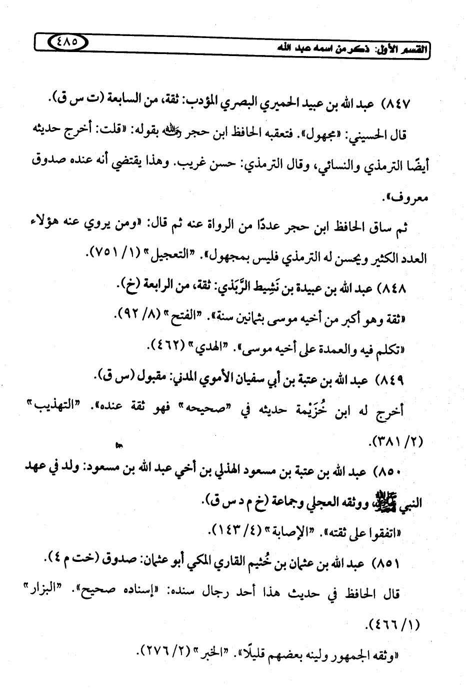 850) عبد الله بن عتبة بن مسعود الهذلي بن أخي عبد الله بن مسعود: ولد في عهد النبي - صلى الله عليه وسلم - ووثقه العجلي وجماعة (خ م د س ق).