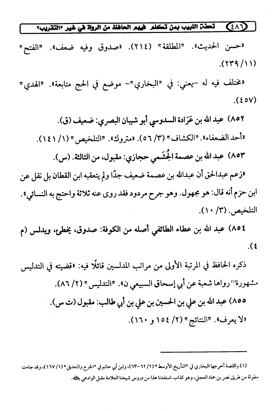 "زعم عبد الحق أن عبد الله بن عصمة ضعيف جدًا ولم يتعقبه ابن القطان بل نقل عن ابن حزم أنه قال: هو مجهول. وهو جرح مردود فقد روى عنه ثلاثة واحتج به النسائي". التلخيص. (3/ 10).