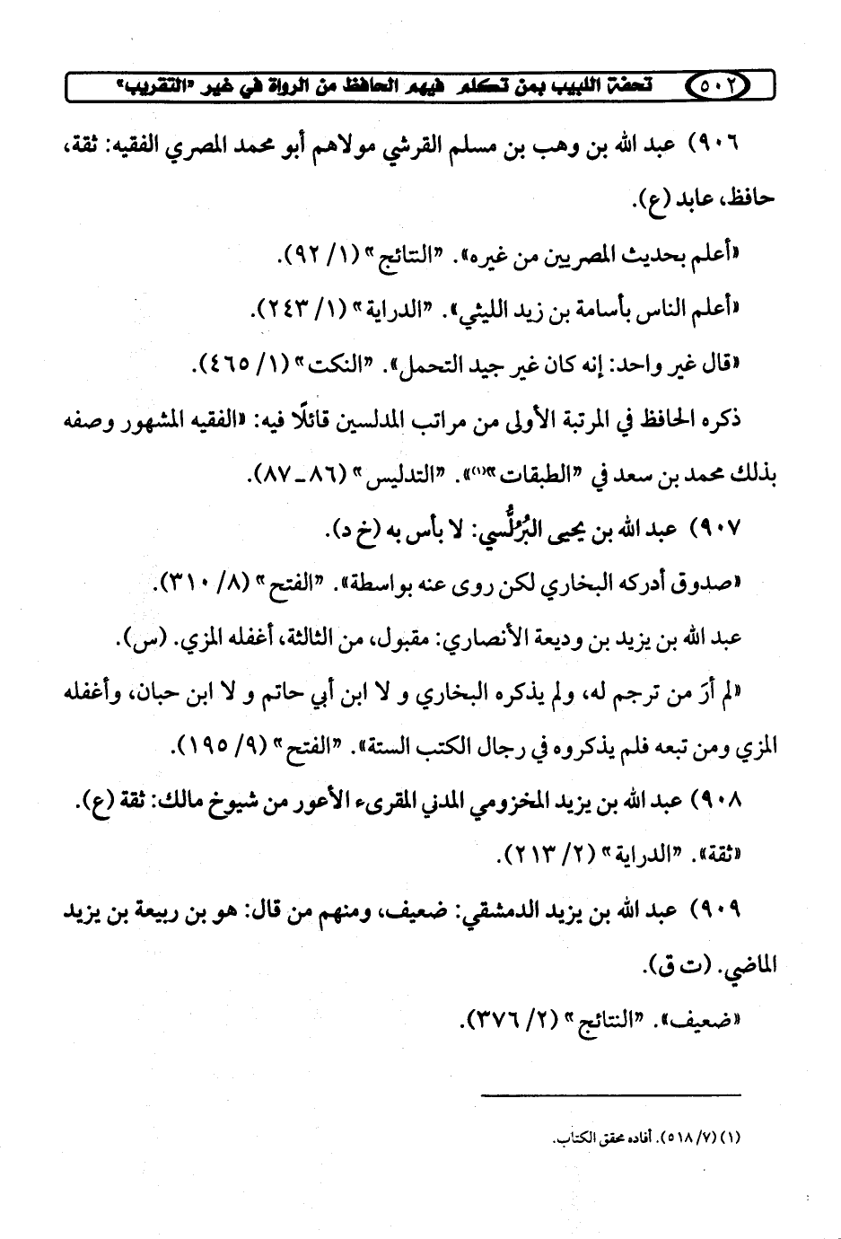 906) عبد الله بن وهب بن مسلم القرشي مولاهم أبو محمد المصري الفقيه: ثقة، حافظ، عابد (ع).