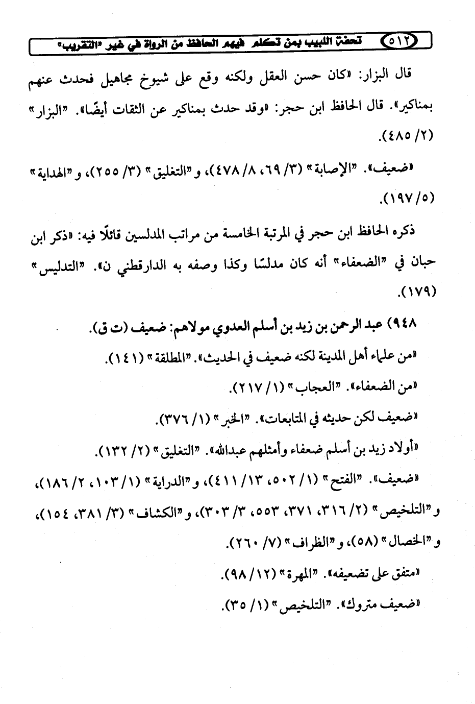 "ضعيف متروك". "التلخيص" (1/ 35).