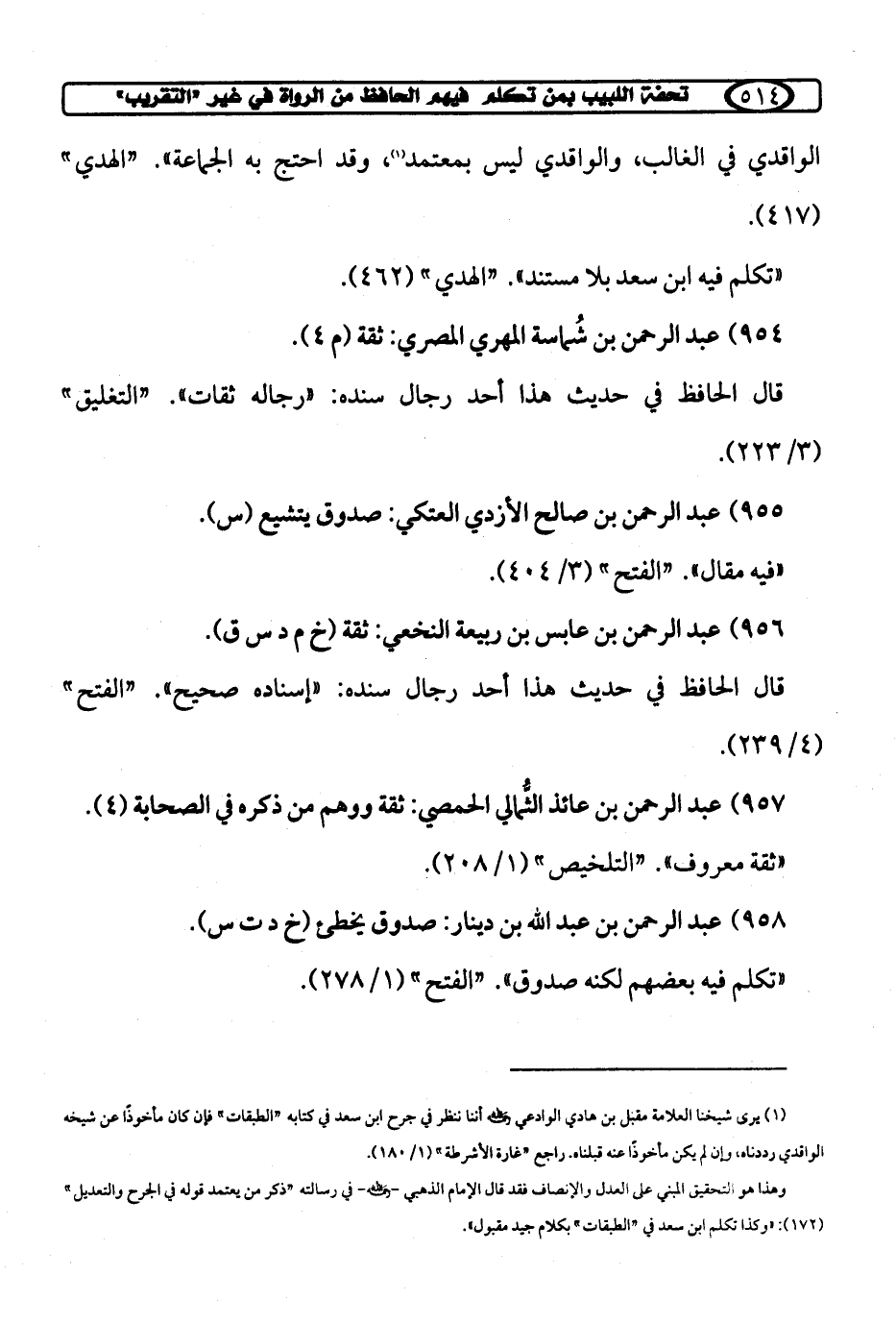 (¬1) يرى شيخنا العلامة مقبل بن هادي الوادعي رحمه الله أننا ننظر في جرح ابن سعد في كتابه "الطبقات" فإن كان مأخوذًا عن شيخه الواقدي رددناه، وإن لم يكن مأخوذًا عنه قبلنا. راجع "غارة الأشرطة" (1/ 180).
