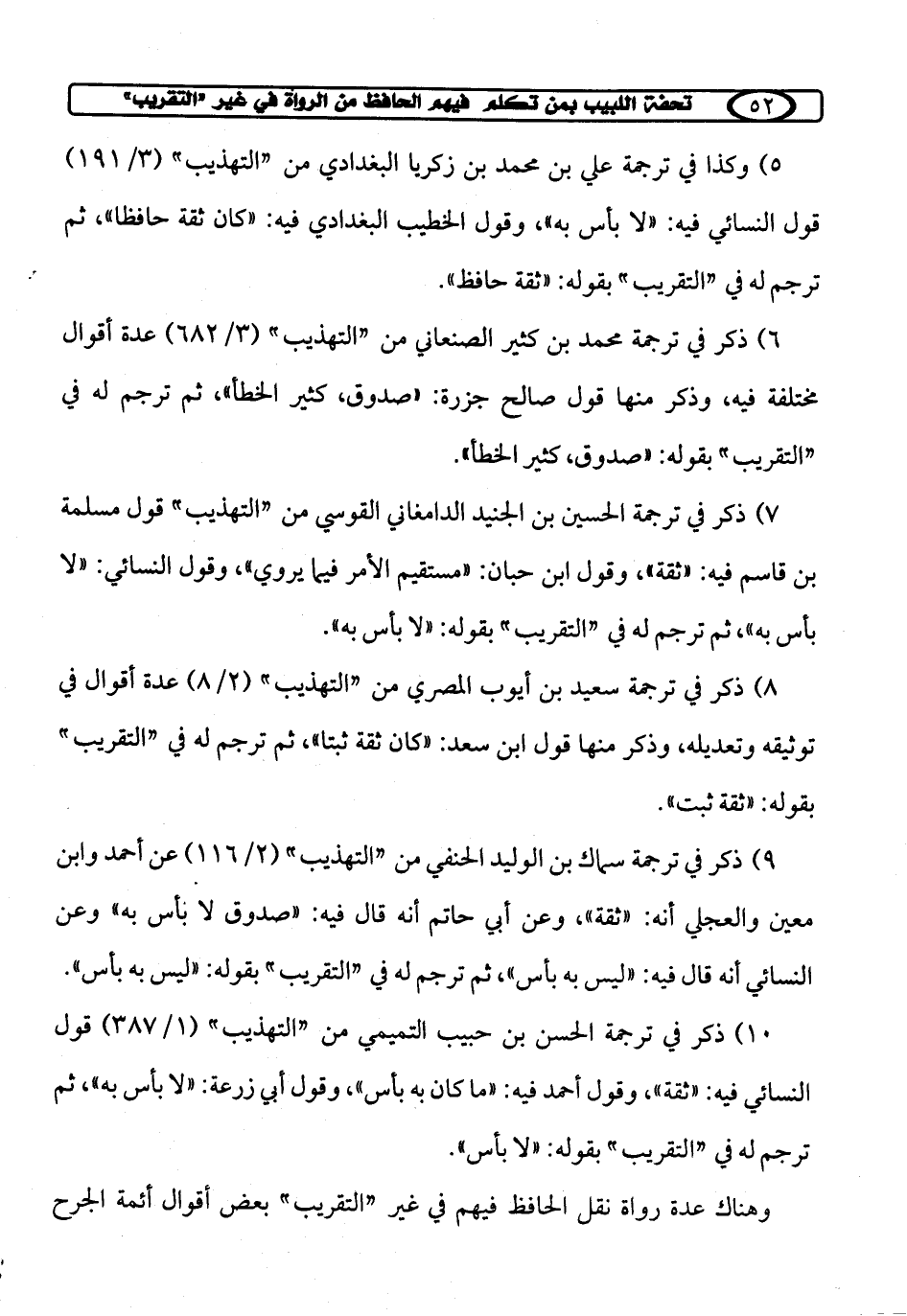 7) ذكر في ترجمة الحسين بن الجنيد الدامغاني القوسي من"التهذيب" قول مسلمة بن قاسم فيه: "ثقة"، وقول ابن حبان: "مستقيم الأمر فيما يروي"، وقول النسائي: "لا بأس به"، ثم ترجم له في"التقريب" بقوله: "لا بأس به".