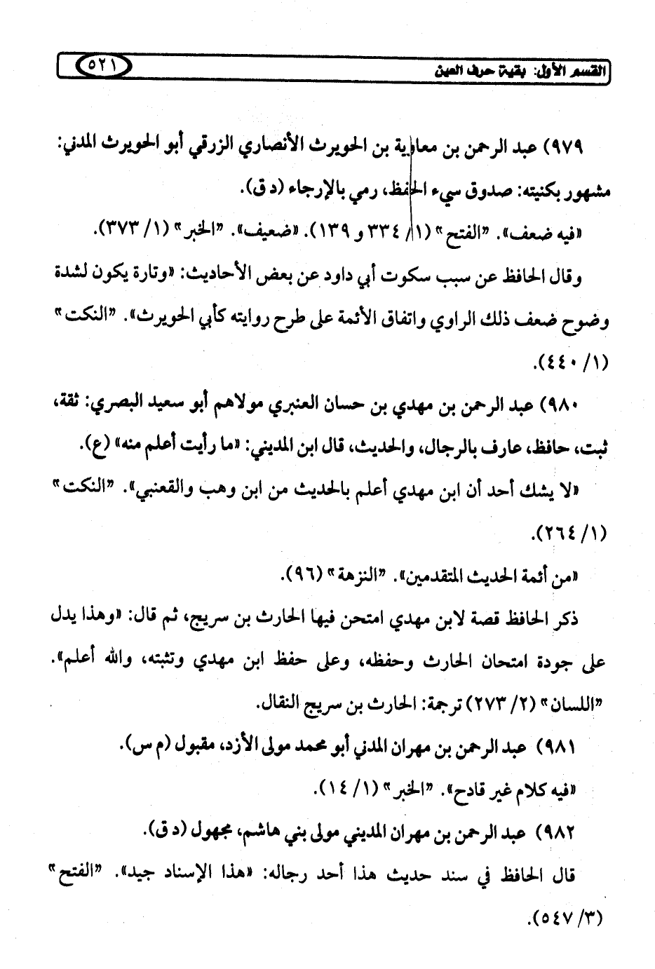 980) عبد الرحمن بن مهدي بن حسان العنبري مولاهم أبو سعيد البصري: ثقة، ثبت، حافظ، عارف بالرجال، والحديث، قال ابن المديني: "ما رأيت أعلم منه" (ع).