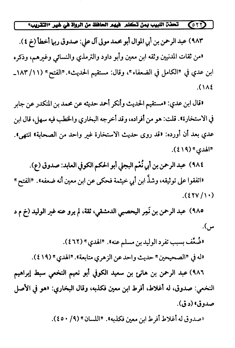 986) عبد الرحمن بن هانئ بن سعيد الكوفي أبو نعيم النخعي سبط إبراهيم النخعي: صدوق، له أغلاط، أفرط ابن معين فكذبه، وقال البخاري: "هو في الأصل صدوق" (د ق).