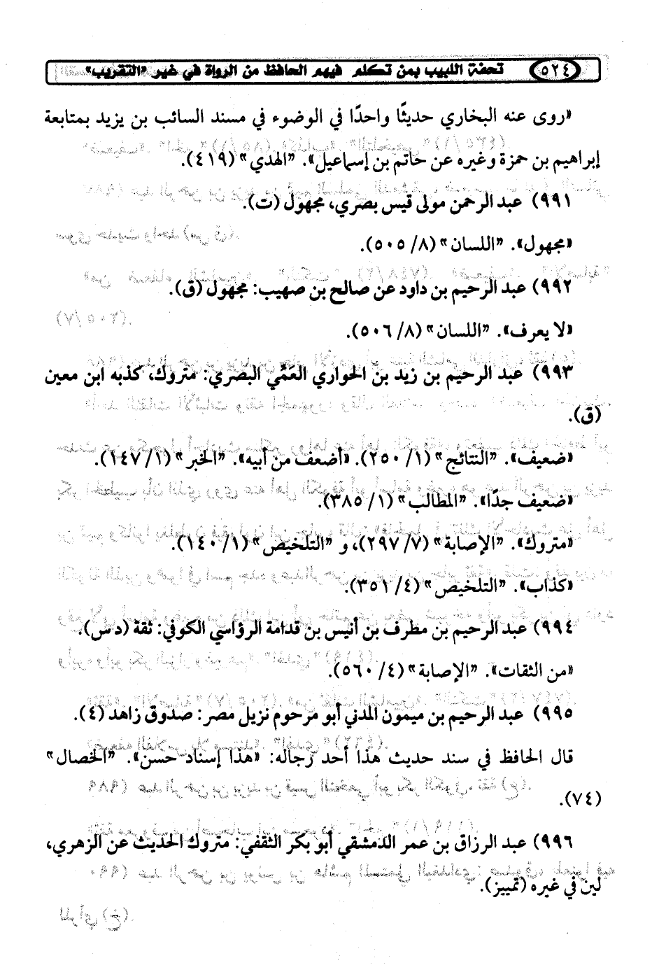 993) عبد الرحيم بن زيد بن الحواري العَمِّي البصري: متروك، كذبه ابن معين (ق).
