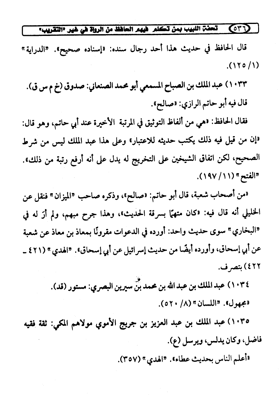 1035) عبد الملك بن عبد العزيز بن جريج الأموي مولاهم المكي: ثقة فقيه فاضل، وكان يدلس، ويرسل (ع).