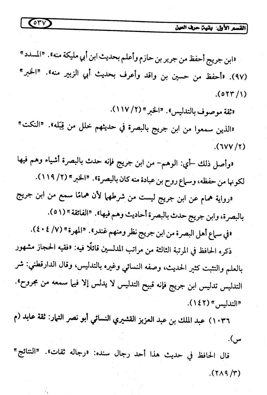 "ابن جريج أحفظ من جرير بن حازم وأعلم بحديث ابن أبي مليكة منه". "المسدد" (97). "أحفظ من حسين بن واقد وأعرف بحديث أبي الزبير منه". "الخبر" (1/ 523).