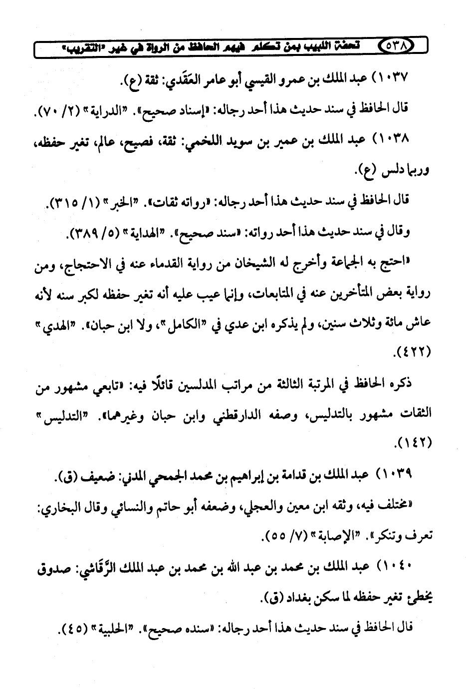 1038) عبد الملك بن عمير بن سويد اللخمي: ثقة، فصيح، عالم، تغير حفظه، وربما دلس (ع).