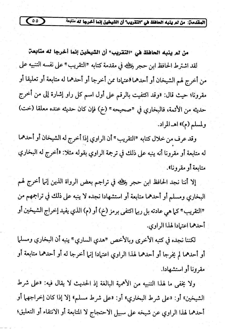 لكننا نجده في كتبه الأخرى وبالأخص "هدي الساري" ينبه أن البخاري ومسلما أو أحدهما لم يخرجا أو أحدهما لهذا الراوي اعتمادا إنما أخرجا له أو أحدهما متابعة أو مقرونا أو استشهادا.