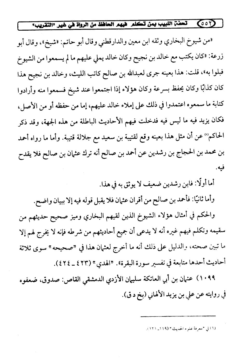 "من شيوخ البخاري وثقه ابن معين والدارقطني وقال أبو حاتم: "شيخ"، وقال أبو زرعة: "كان يكتب مع خالد بن نجيح وكان خالد يملي عليهم ما لم يسمعوا من الشيوخ فبلوا به"، قلت: هذا بعينه جرى لعبد الله بن صالح كاتب الليث، وخالد بن نجيح هذا كان كذابًا وكان يحفظ بسرعة وكان هؤلاء إذا اجتمعوا عند شيخ فسمعوا منه وأرادوا كتابة ما سمعوه اعتمدوا في ذلك على إملاء خالد عليهم، إما من حفظه أو من الأصل، فكان يزيد فيه ما ليس فيه فدخلت فيهم الأحاديث الباطلة من هذه الجهة، وقد ذكر الحاكم (¬1) عن أن مثل هذا بعينه وقع لقتيبة بن سعيد مع جلالة قتيبة. وأما ما رواه أحمد بن محمد بن الحجاج بن رشدين عن أحمد بن صالح أنه ترك عثمان بن صالح فلا يقدح فيه.