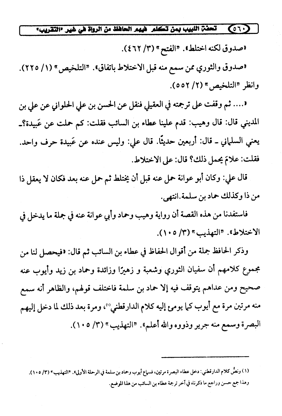 " .... ثم وقفت على ترجمته في العقيلي فنقل عن الحسن بن علي الحلواني عن علي بن المديني قال: قال وهيب: قدم علينا عطاء بن السائب فقلت: كلم حملت عن عَبيدة؟ - يعني السلماني- قال: أربعين حديثًا. قال علي: وليس عنده عن عَبيدة حرف واحد. فقلت: علامَ يحمل ذلك؟ قال: على الإختلاط.
