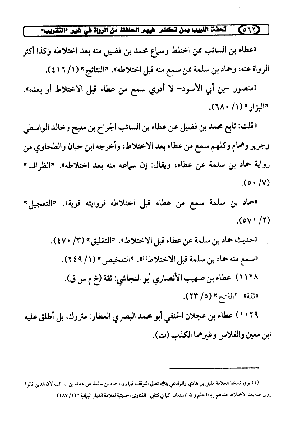(¬1) يرى شيخنا العلامة مقبل بن هادي والوادعي رحمه الله تعالى التوقف فيما رواه حماد بن سلمة عن عطاء بن السائب لأن الذين قالوا روى عنه بعد الإختلاط عندهم زيادة علم والله المستعان، كما في كتابي "الفتاوى الحديثية لعلامة الديار اليمانية" (2/ 287).
