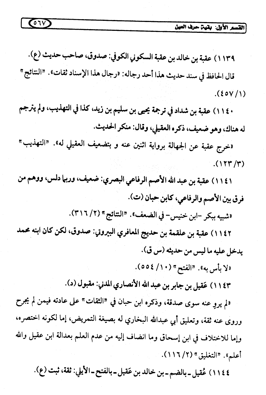 1142) عقبة بن علقمة بن حديج المعافري البيروتي: صدوق، لكن كان ابنه محمد يدخل عليه ما ليس من حديثه (س ق).