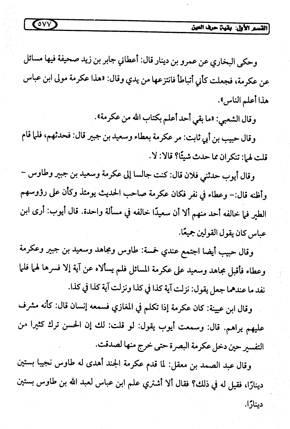وحكى البخاري عن عمرو بن دينار قال: أعطاني جابر بن زيد صحيفة فيها مسائل عن عكرمة، فجعلت كأني أتباطأ فانتزعها من يدي وقال: "هذا عكرمة مولى ابن عباس هذا أعلم الناس".