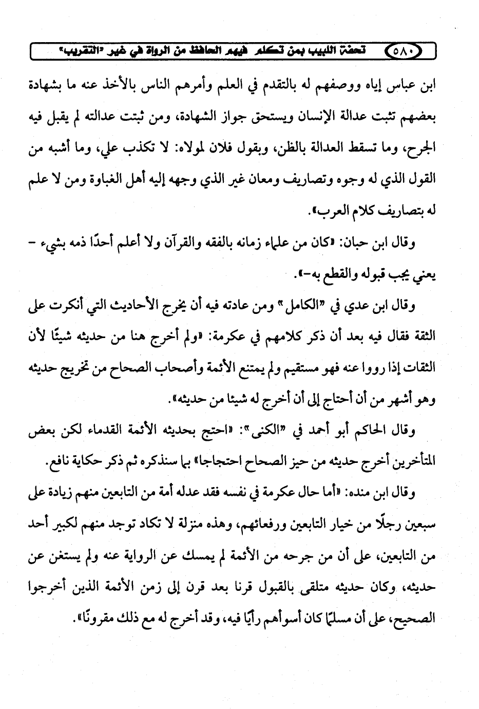 وقال ابن عدي في "الكامل" ومن عادته فيه أن يخرج الأحاديث التي أنكرت على الثقة فقال فيه بعد أن ذكر كلامهم في عكرمة: "ولم أخرج هنا من حديثه شيئًا لأن الثقات إذا رووا عنه فهو مستقيم ولم يمتنع الأئمة وأصحاب الصحاح من تخريج حديثه وهو أشهر من أن أحتاج إلى أن أخرج له شيئا من حديثه".