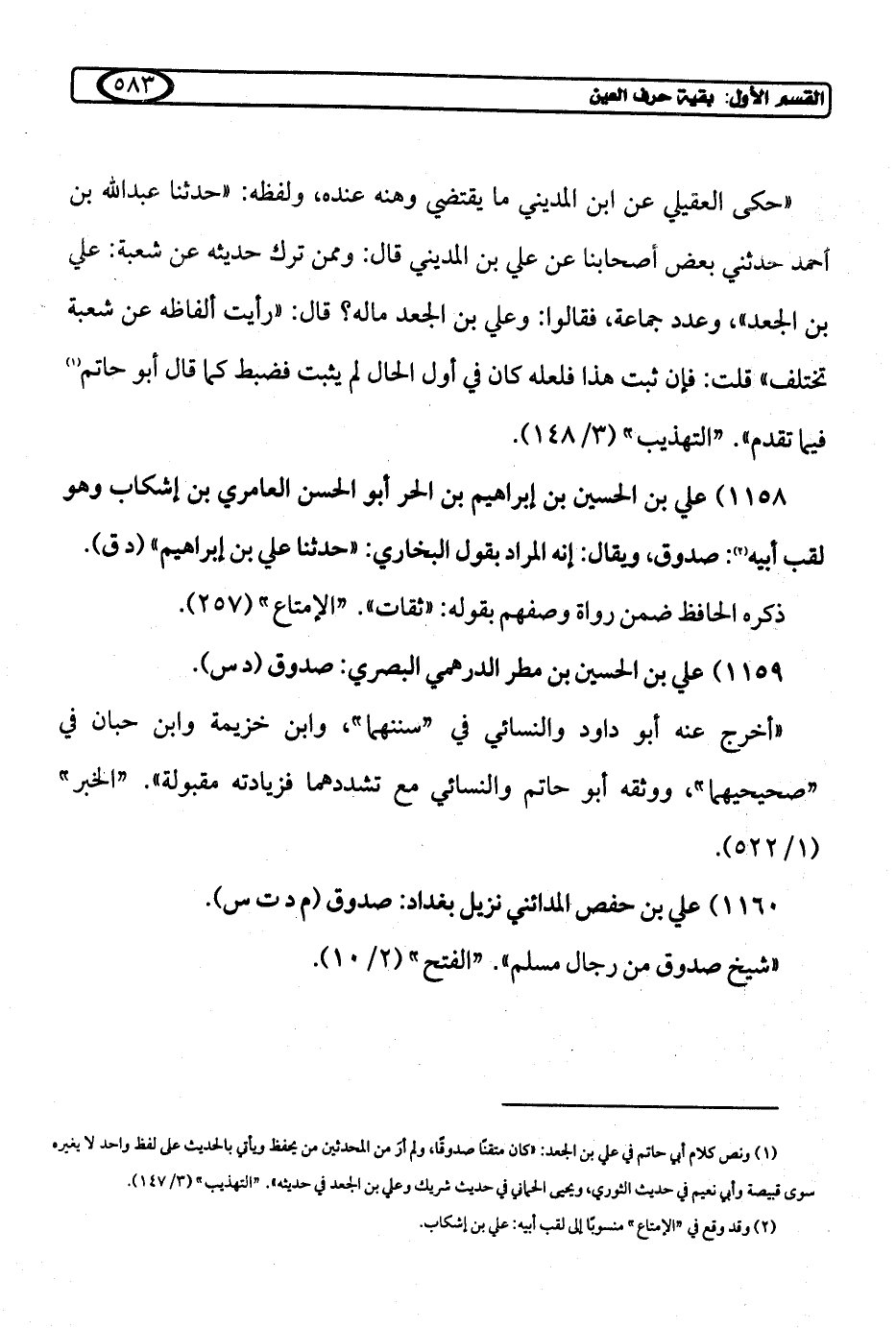 1158) علي بن الحسين بن إبراهيم بن الحر أبو الحسن العامري بن إشكاب وهو لقب أبيه (¬2): صدوق، ويقال: إنه المراد بقول البخاري: "حدثنا علي بن إبراهيم" (د ق).