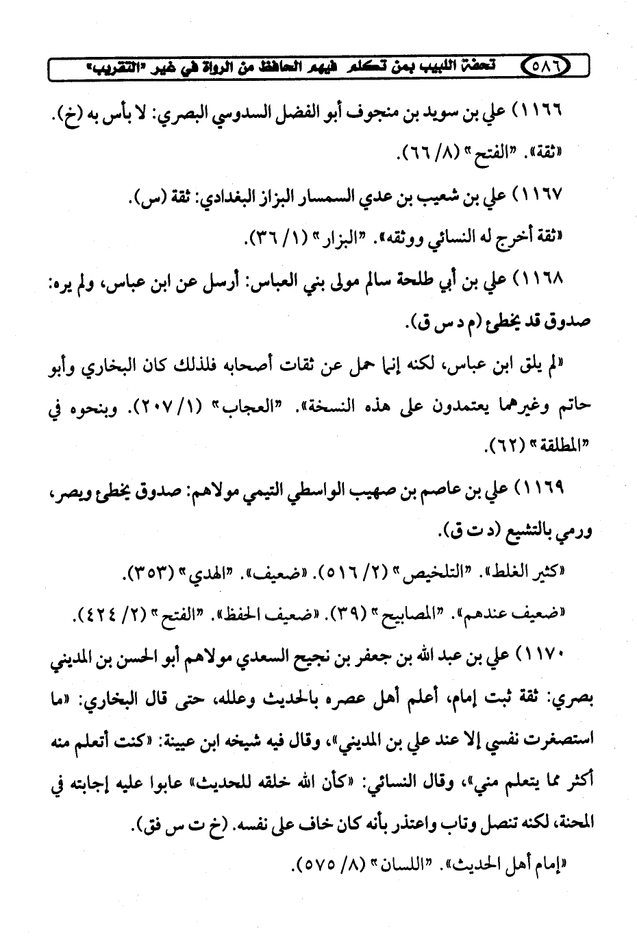 1170) علي بن عبد الله بن جعفر بن نجيح السعدي مولاهم أبو الحسن بن المديني بصري: ثقة ثبت إمام، أعلم أهل عصره بالحديث وعلله، حتى قال البخاري: "ما استصغرت نفسي إلا عند علي بن المديني"، وقال فيه شيخه ابن عيينة: "كنت أتعلم منه أكثر مما يتعلم مني"، وقال النسائي: "كأن الله خلقه للحديث" عابوا عليه إجابته في المحنة، لكنه تنصل وتاب واعتذر بأنه كان خاف على نفسه. (خ ت س فق).