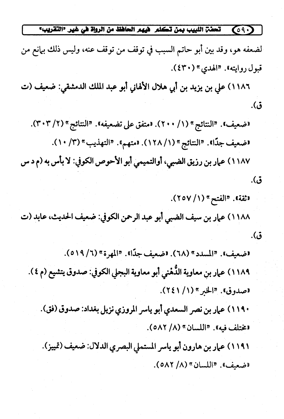 1188) عمار بن سيف الضبي أبو عبد الرحمن الكوفي: ضعيف الحديث، عابد (ت ق).