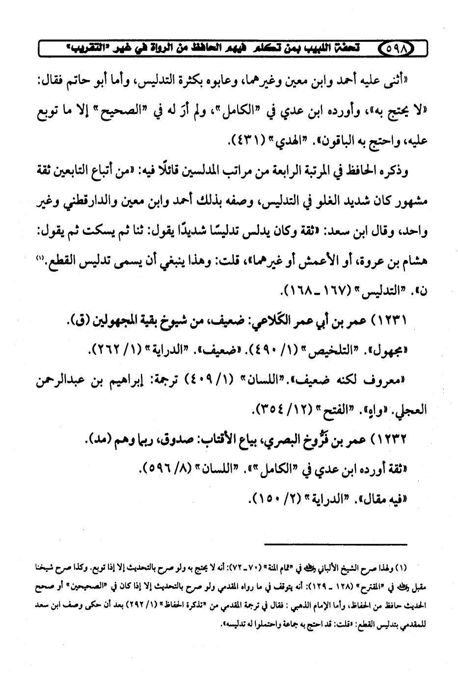 (¬1) ولهذا صرح الشيخ الألباني رحمه الله في "تمام المنة" (70 - 72): أنه لا يحتج به ولو صرح بالتحديث إلا إذا توبع. وكذا صرح شيخنا مقبل رحمه الله في "المقترح" (128 - 129): أنه يتوقف في ما رواه المقدمي ولو صرح بالتحديث إلا إذا كان في "الصحيحين" أو صحح الحديث حافظ من الحفاظ، وأما الإمام الذهبي: فقال في ترجمة المقدمي من "تذكرة الحفاظ" (1/ 292) بعد أن حكى وصف ابن سعد للمقدمي بتدليس القطع: "قلت: قد احتج به جماعة واحتملوا له تدليسه".