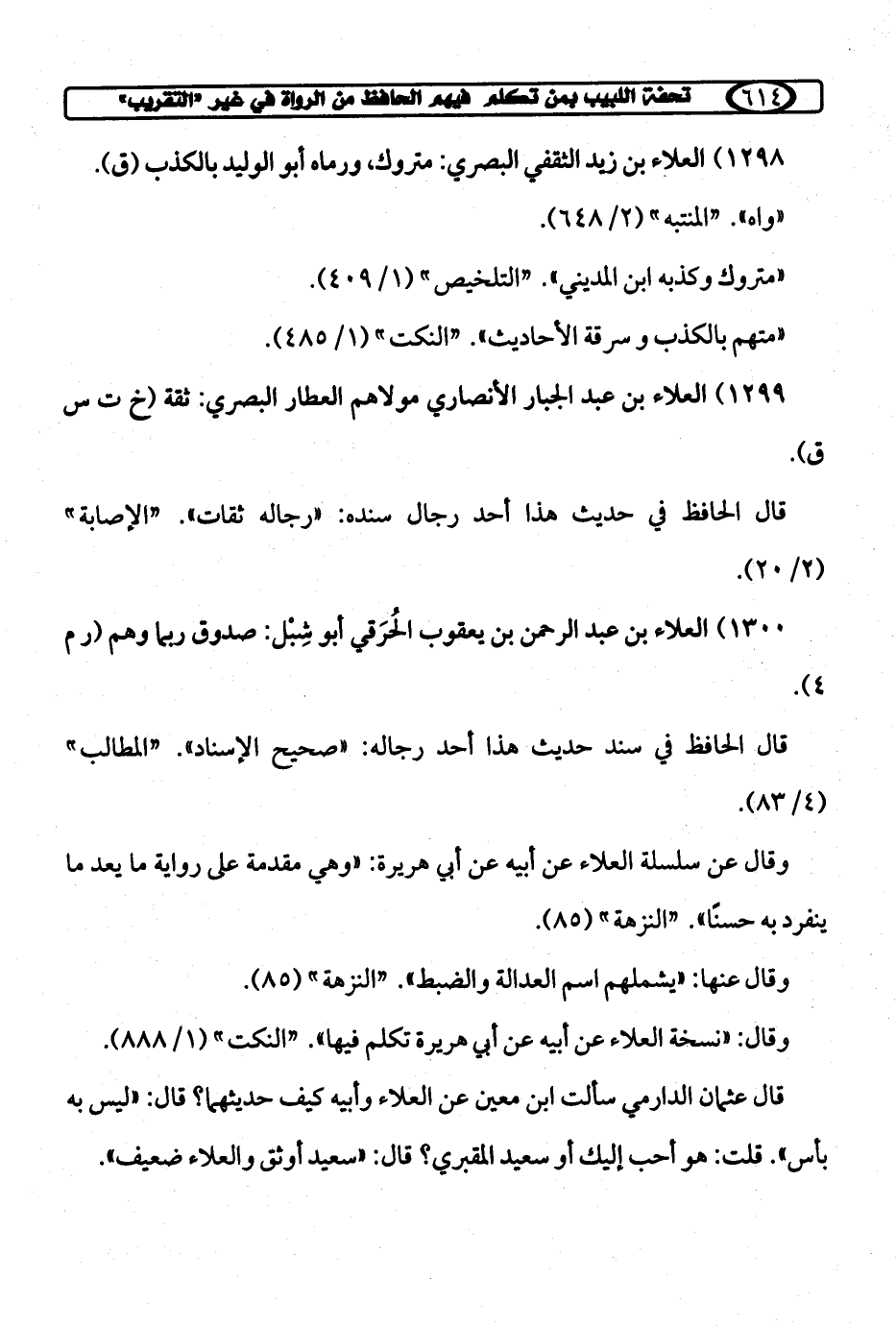 1298) العلاء بن زيد الثقفي البصري: متروك، ورماه أبو الوليد بالكذب (ق).