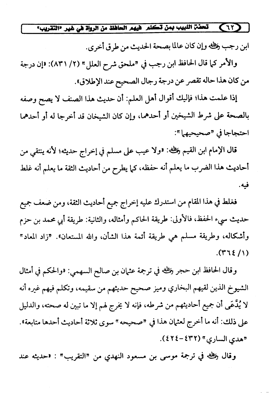 فغلط في هذا المقام من استدرك عليه إخراج جميع أحاديث الثقة، ومن ضعف جميع حديث سيء الحفظ، فالأولى: طريقة الحاكم وأمثاله، والثانية: طريقة أبي محمد بن حزم وأشكاله، وطريقة مسلم هي طريقة أئمة هذا الشأن، والله المستعان". "زاد المعاد" (1/ 364).