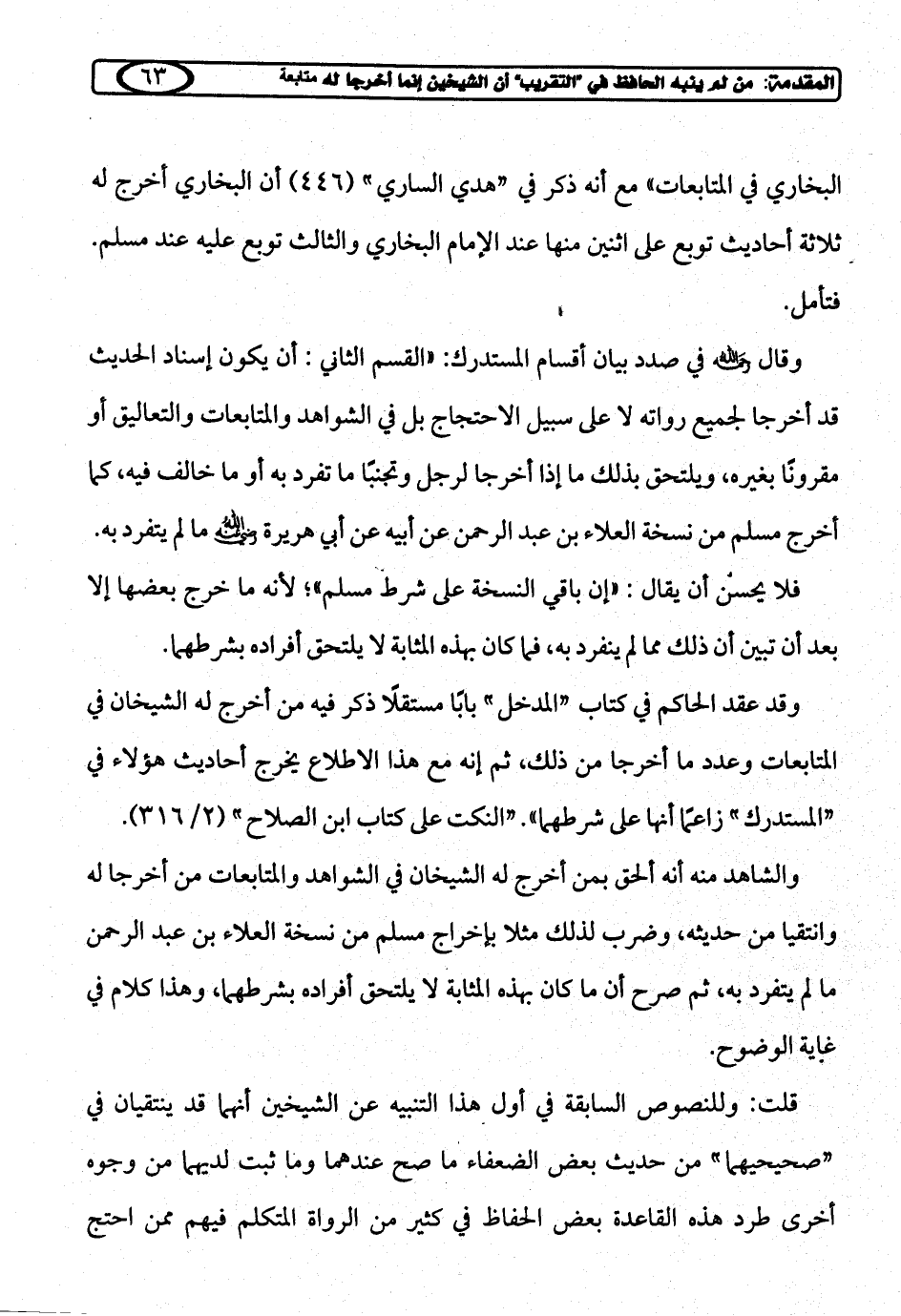 وقال رحمه الله في صدد بيان أقسام المستدرك: "القسم الثاني: أن يكون إسناد الحديث قد أخرجا لجميع رواته لا على سبيل الاحتجاج بل في الشواهد والمتابعات والتعاليق أو مقرونًا بغيره، ويلتحق بذلك ما إذا أخرجا لرجل وتجنبًا ما تفرد به أو ما خالف فيه، كما أخرج مسلم من نسخة العلاء بن عبد الرحمن عن أبيه عن أبي هريرة - رضي الله عنه - ما لم يتفرد به.