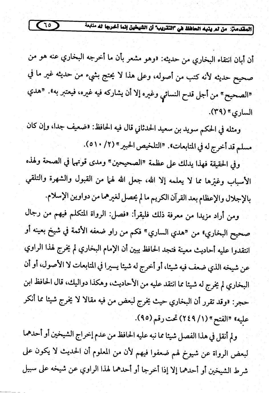 ومن أراد مزيدا من معرفة ذلك فليقرأ: "فصل: الرواة المتكلم فيهم من رجال صحيح البخاري" من"هدي الساري" فكم من راو ضعفه الأئمة في شيخ بعينه أو انتقدوا عليه أحاديث معينة فتجد الحافظ يبين أن الإمام البخاري لم يخرج لهذا الراوي عن شيخه الذي ضعف فيه شيئا، أو أخرج له شيئا يسيرا في المتابعات لا الأصول، أو أن البخاري لم يخرج له شيئا مما انتقد عليه من الأحاديث، وهكذا دواليك، قال الحافظ ابن حجر: "وقد تقرر أن البخاري حيث يخرج لبعض من فيه مقالا لا يخرج شيئا مما أنكر عليه" "الفتح" (1/ 249) تحت رقم (95).