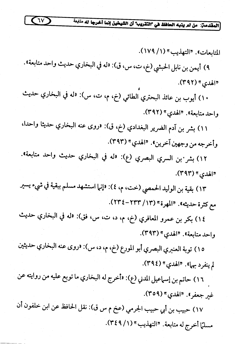 13) بقية بن الوليد الحمصي (خت، م، 4): "إنما استشهد مسلم ببقية في شيء يسير مع كثرة حديثه". "المهرة" (13/ 233 - 234).