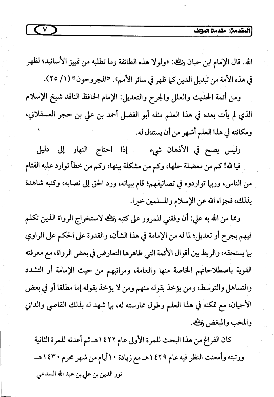 الله. قال الإمام ابن حبان رحمه الله: "ولولا هذه الطائفة وما تطلبه من تمييز الأسانيد؛ لظهر في هذه الأمة من تبديل الدين كما ظهر في سائر الأمم". "المجروحون" (1/ 25).