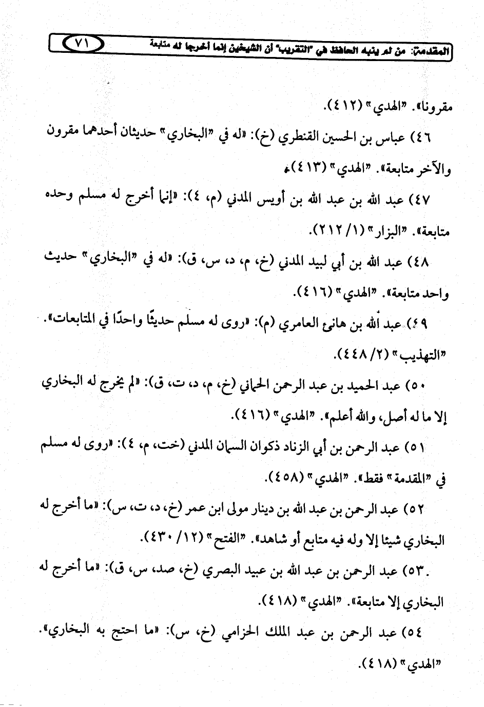 50) عبد الحميد بن عبد الرحمن الحماني (خ، م، د، ت، ق): "لم يخرج له البخاري إلا ما له أصل، والله أعلم". "الهدي" (416).
