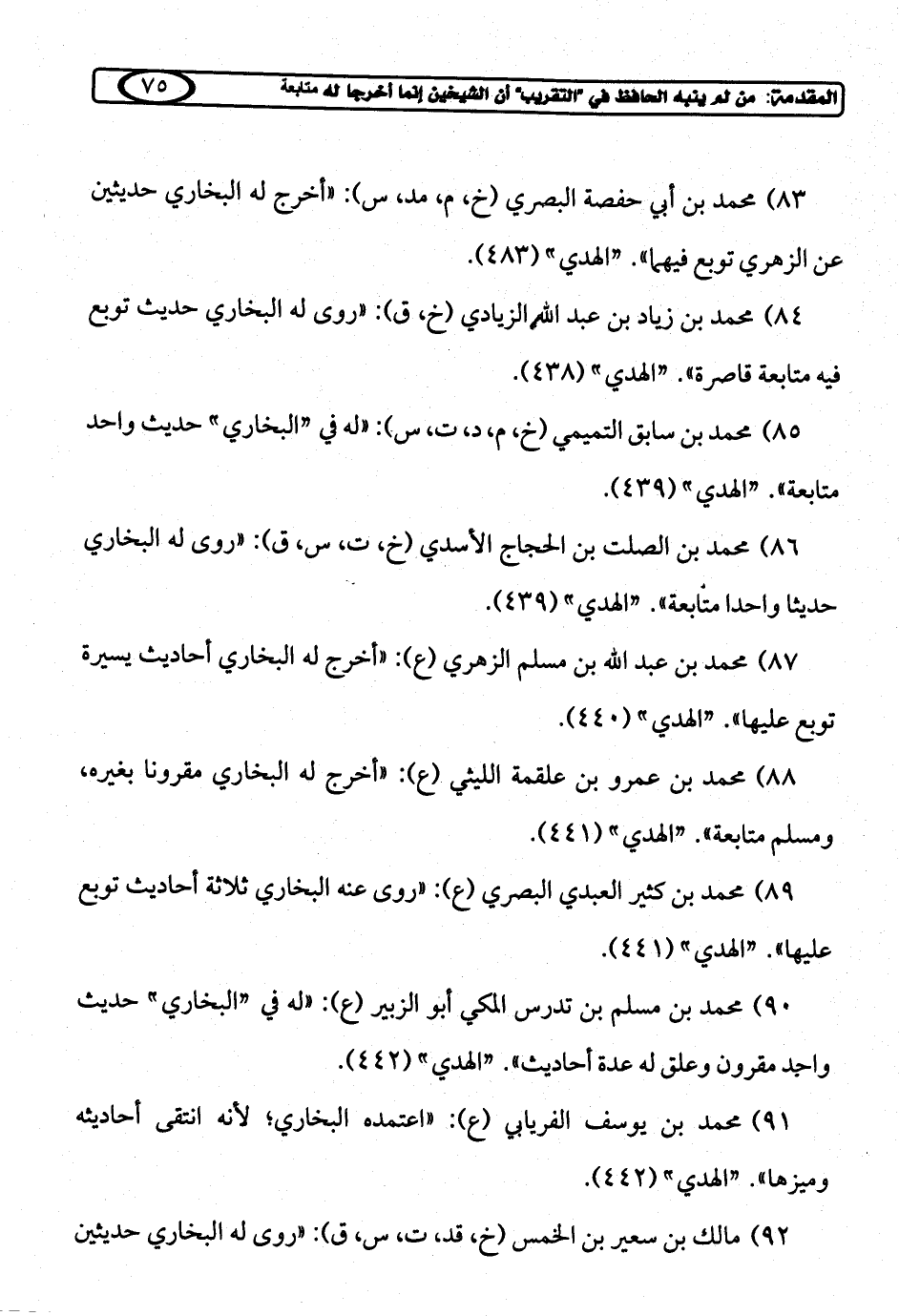 83) محمد بن أبي حفصة البصري (خ، م، مد، س): "أخرج له البخاري حديثين عن الزهري توبع فيهما". "الهدي" (483).