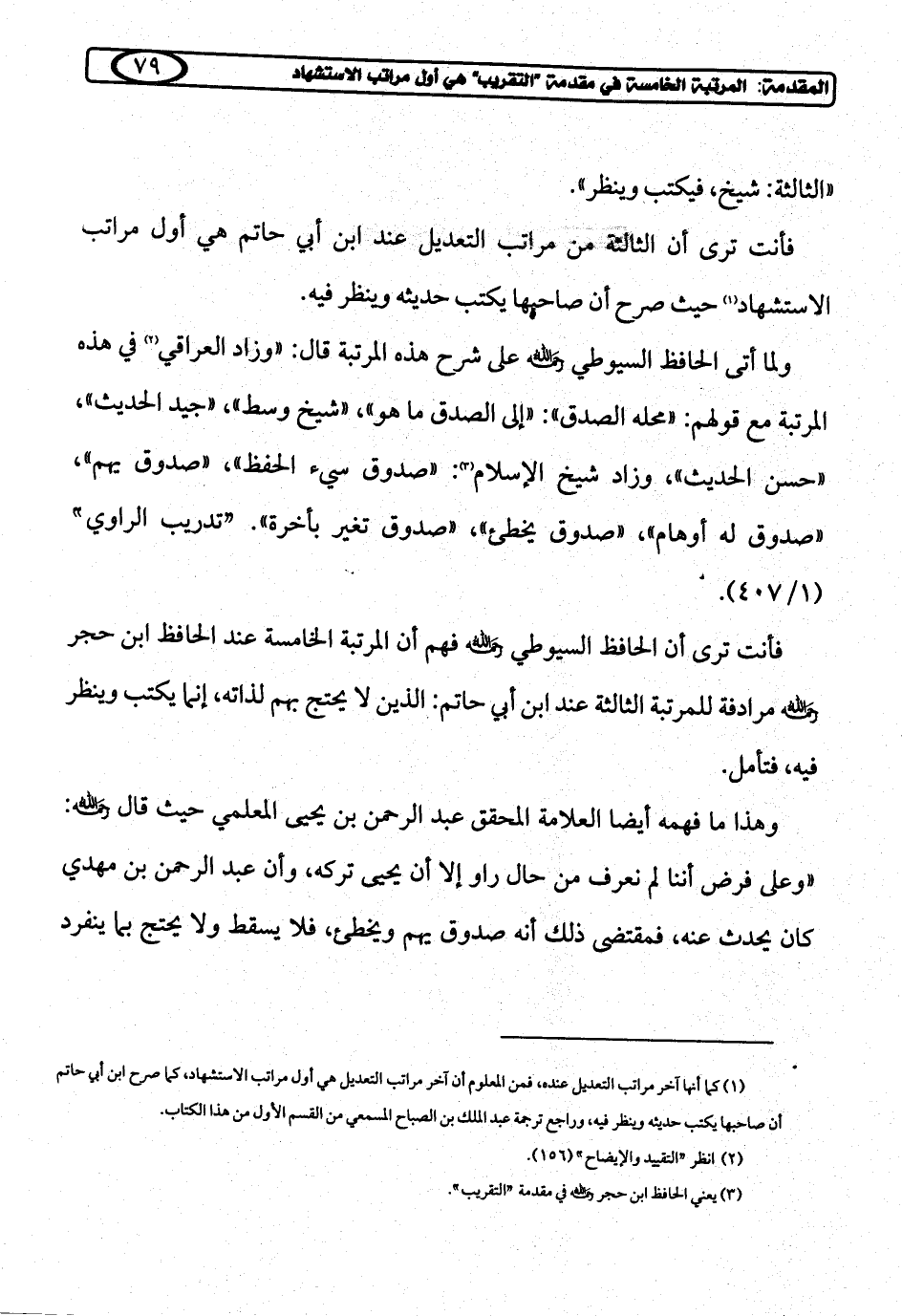 فأنت ترى أن الحافظ السيوطي رحمه الله فهم أن المرتبة الخامسة عند الحافظ ابن حجر رحمه الله مرادفة للمرتبة الثالثة عند ابن أبي حاتم: الذين لا يحتج بهم لذاته، إنما يكتب وينظر فيه، فتأمل.
