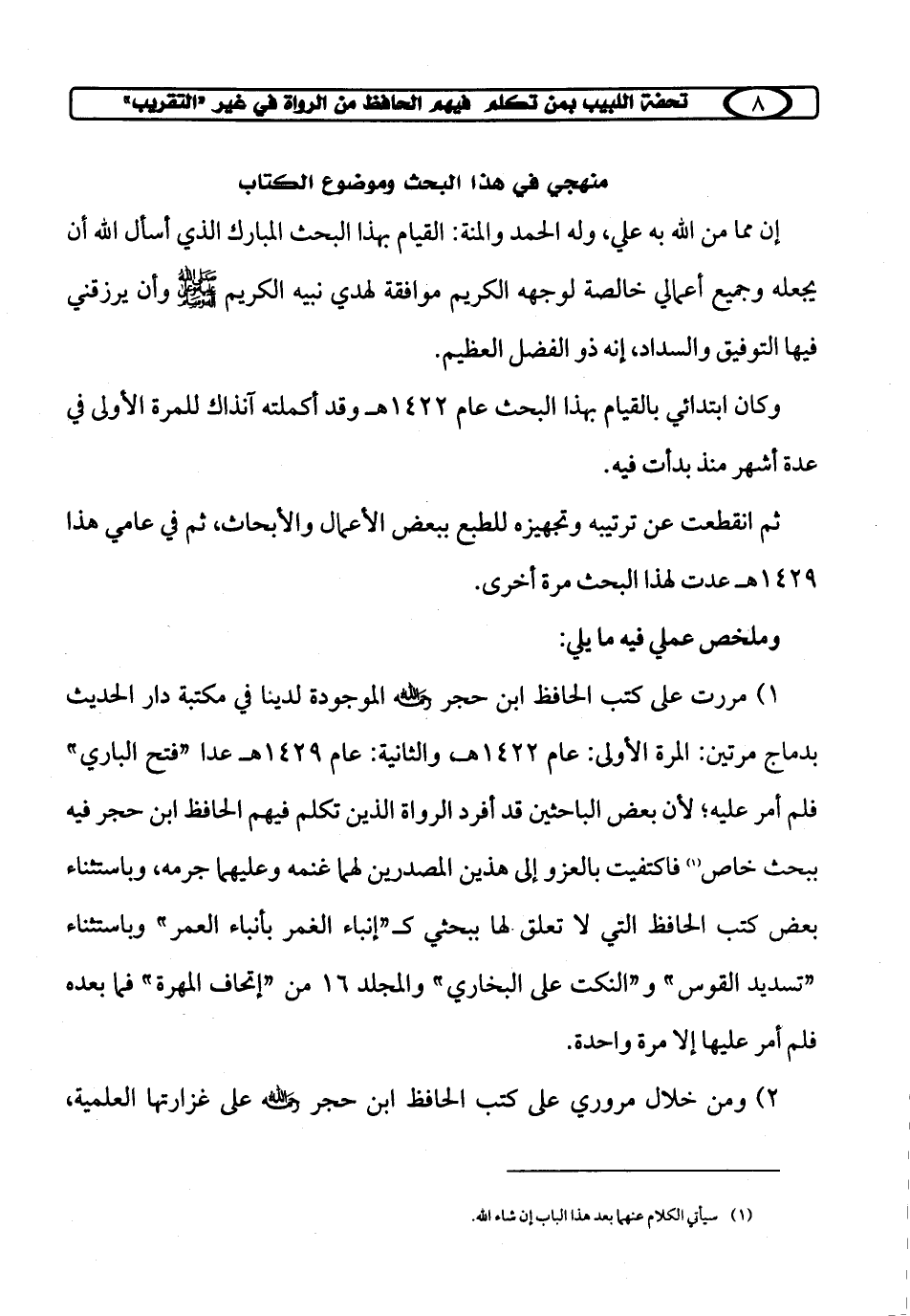 1) مررت على كتب الحافظ ابن حجر رحمه الله الموجودة لدينا في مكتبة دار الحديث بدماج مرتين: المرة الأولى: عام 1422 هـ والثانية: عام 1429 هـ عدا "فتح الباري" فلم أمر عليه؛ لأن بعض الباحثين قد أفرد الرواة الذين تكلم فيهم الحافظ ابن حجر فيه ببحث خاص (¬1) فاكتفيت بالعزو إلى هذين المصدرين لهما غنمه وعليهما جرمه، وباستثناء بعض كتب الحافظ التي لا تعلق لها ببحثي كـ "إنباء الغمر بأنباء العمر" وباستثناء "تسديد القوس" و "النكت على البخاري" والمجلد 16 من "إتحاف المهرة" فما بعده فلم أمر عليها إلا مرة واحدة.