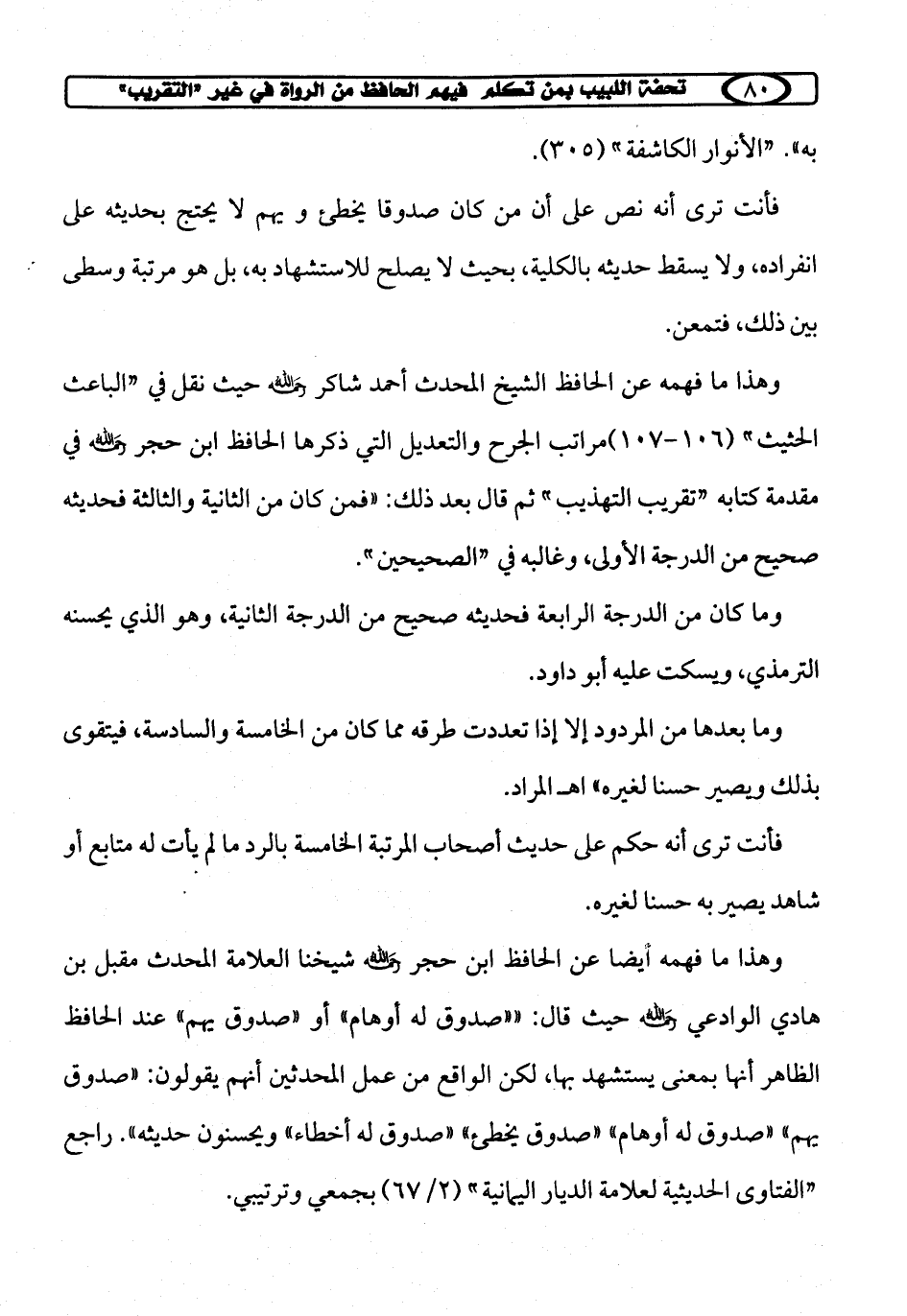 فأنت ترى أنه نص على أن من كان صدوقا يخطئ ويهم لا يحتج بحديثه على انفراده، ولا يسقط حديثه بالكلية، بحيث لا يصلح للاستشهاد به، بل هو مرتبة وسطى بين ذلك، فتمعن.