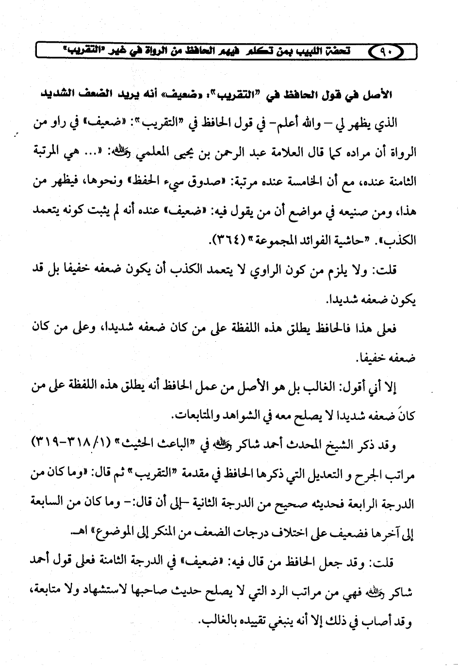 قلت: وقد جعل الحافظ من قال فيه: "ضعيف" في الدرجة الثامنة فعلى قول أحمد شاكر رحمه الله فهي من مراتب الرد التي لا يصلح حديث صاحبها لاستشهاد ولا متابعة، وقد أصاب في ذلك إلا أنه ينبغي تقييده بالغالب.