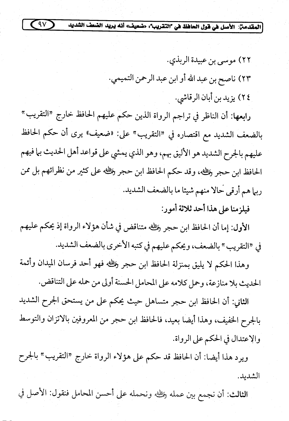 الأول: إما أن الحافظ ابن حجر رحمه الله متناقض في شأن هؤلاء الرواة إذ يحكم عليهم في "التقريب" بالضعف، ويحكم عليهم في كتبه الأخرى بالضعف الشديد.