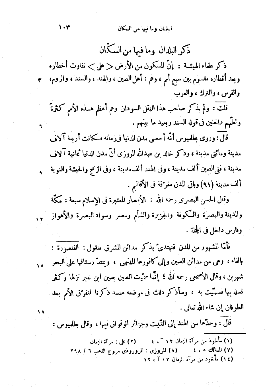قال: (3) وروى بطليموس أنّه أحصى مدن الدنيا فى زمانه فكانت أربعة آلاف مدينة ومائتى مدينة، وذكر خالد بن عبد الله المروزى (4) أنّ مدن الدنيا ثمانية آلاف مدينة، ففى الصين ألف مدينة، وفى الهند ألف مدينة، وفى الزنج والحبشة والنوبة ألف مدينة (91) وباقى المدن مفرّقة فى الأقاليم.