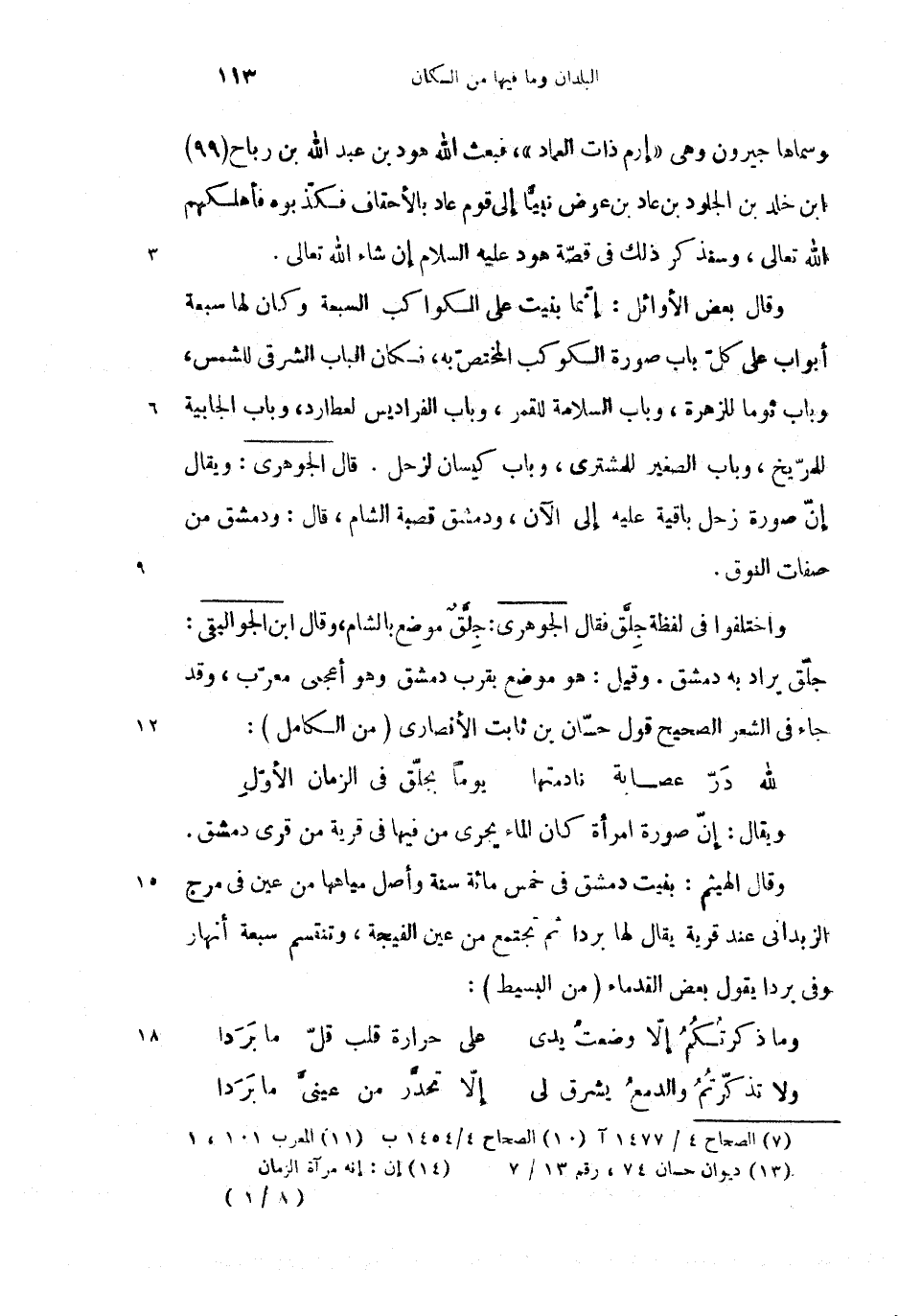 وقال الهيثم: بنيت دمشق فى خمس مائة سنة وأصل مياهها من عين فى مرج الزبدانى عند قرية يقال لها بردا ثم تجتمع من عين الفيجة، وتنقسم سبعة أنهار وفى بردا يقول بعض القدماء (من البسيط):