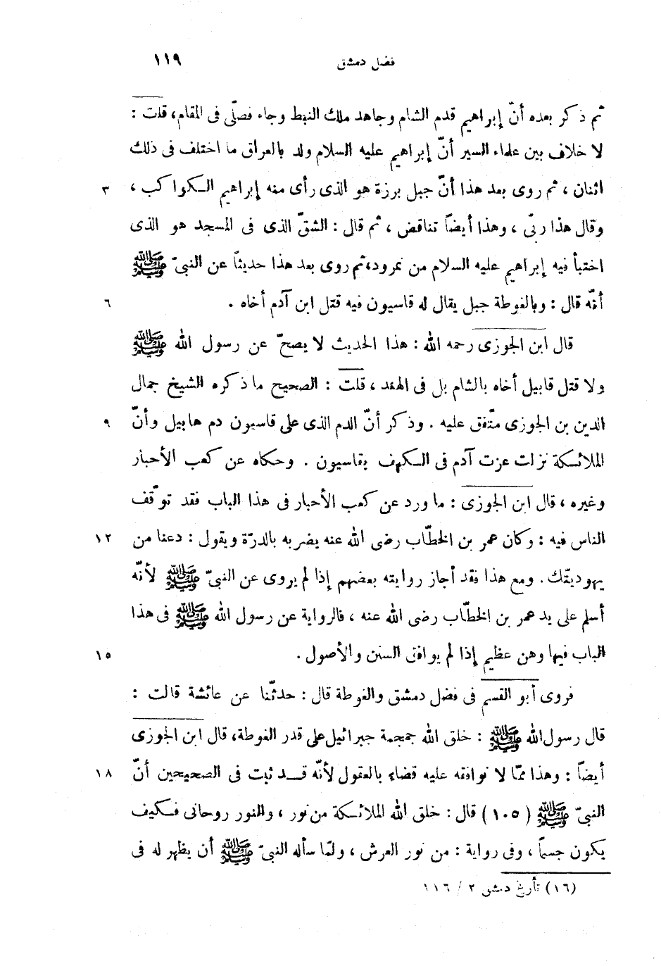 لا خلاف بين علماء السير أنّ إبراهيم عليه السلام ولد بالعراق ما اختلف فى ذلك اثنان، ثم روى بعد هذا أنّ جبل برزة هو الذى رأى منه إبراهيم الكواكب، وقال هذا ربّى، وهذا أيضا تناقض، ثم قال: الشقّ الذى فى المسجد هو الذى اختبأ فيه إبراهيم عليه السلام من نمرود، ثم روى بعد هذا حديثا عن النبىّ صلى الله عليه وسلم أنّه قال: وبالغوطة جبل يقال له قاسيون فيه قتل ابن آدم أخاه.