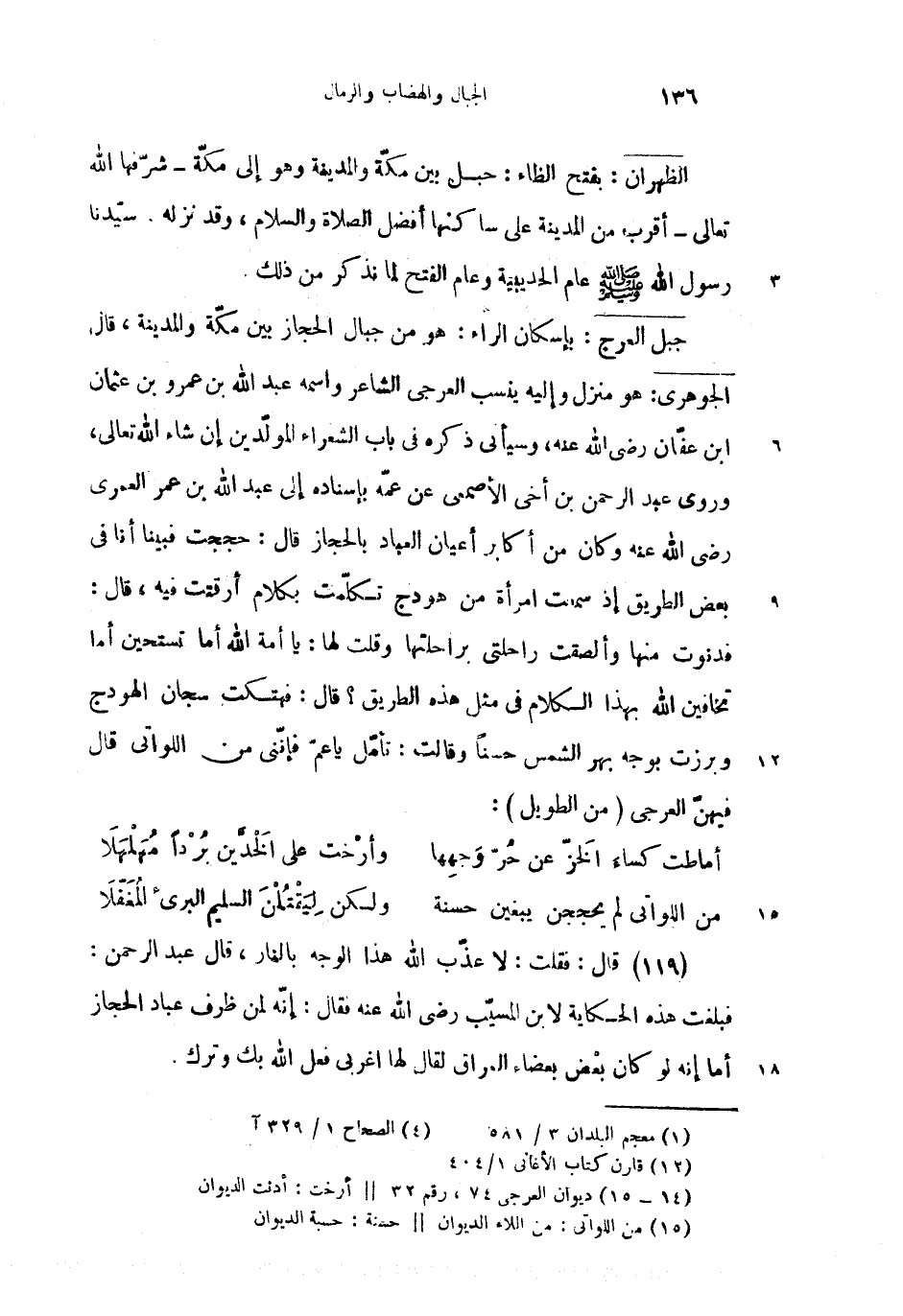 جبل العرج: (2) بإسكان الراء: هو من جبال الحجاز بين مكّة والمدينة، قال الجوهرى: هو منزل وإليه ينسب العرجى الشاعر واسمه عبد الله بن عمرو بن عثمان ابن عفّان رضى الله عنه، وسيأتى ذكره فى باب الشعراء المولّدين إن شاء الله تعالى، وروى عبد الرحمن بن أخى الأصمعى عن عمّه بإسناده إلى عبد الله بن عمر العمرى رضى الله عنه وكان من أكابر أعيان العباد بالحجاز قال: حججت فبينا أنا فى بعض الطريق إذ سمعت امرأة من هودج تكلّمت بكلام أرقتت فيه، قال: