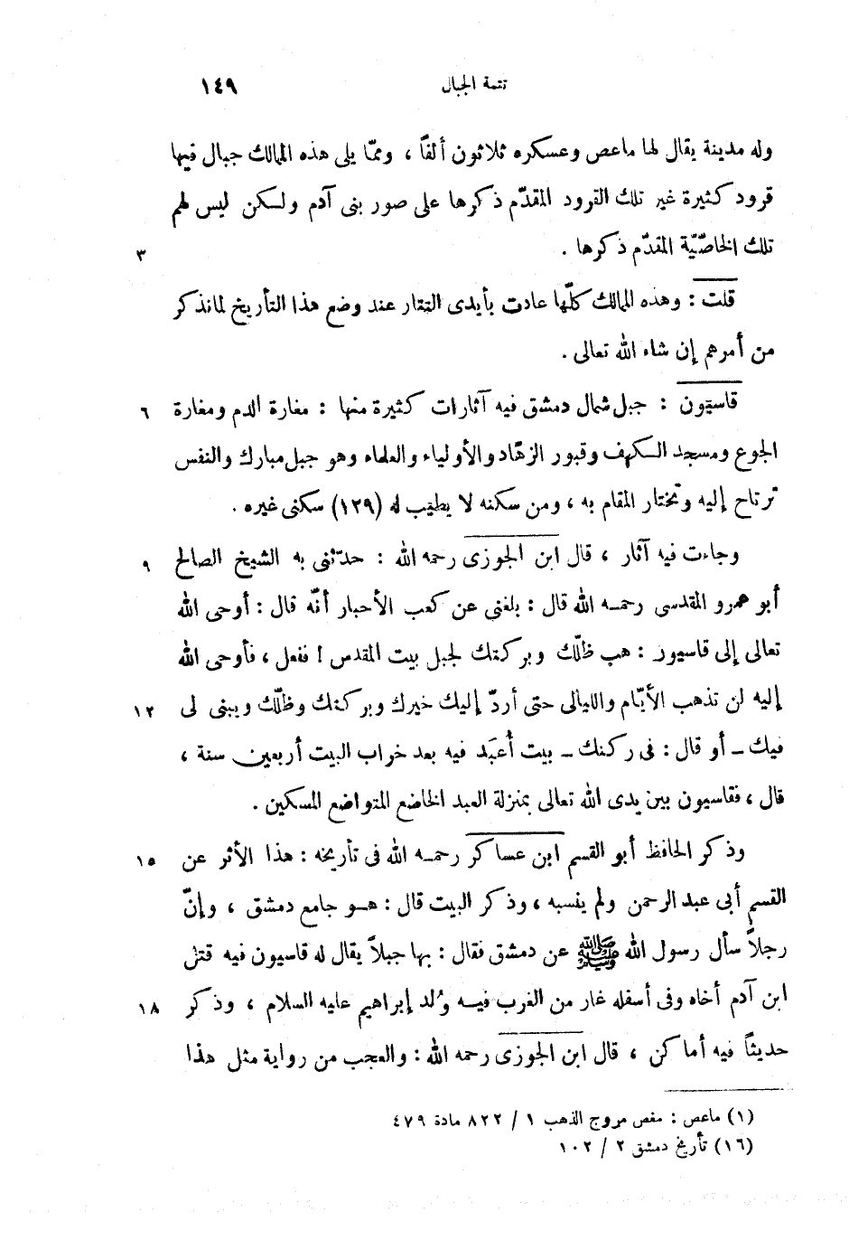 قاسيون: جبل شمال دمشق فيه آثارات كثيرة منها: مغارة الدم ومغارة الجوع ومسجد الكهف وقبور الزهّاد والأولياء والعلماء وهو جبل مبارك والنفس ترتاح إليه وتختبر المقام به، ومن سكنه لا يطيب له (129) سكنى غيره.