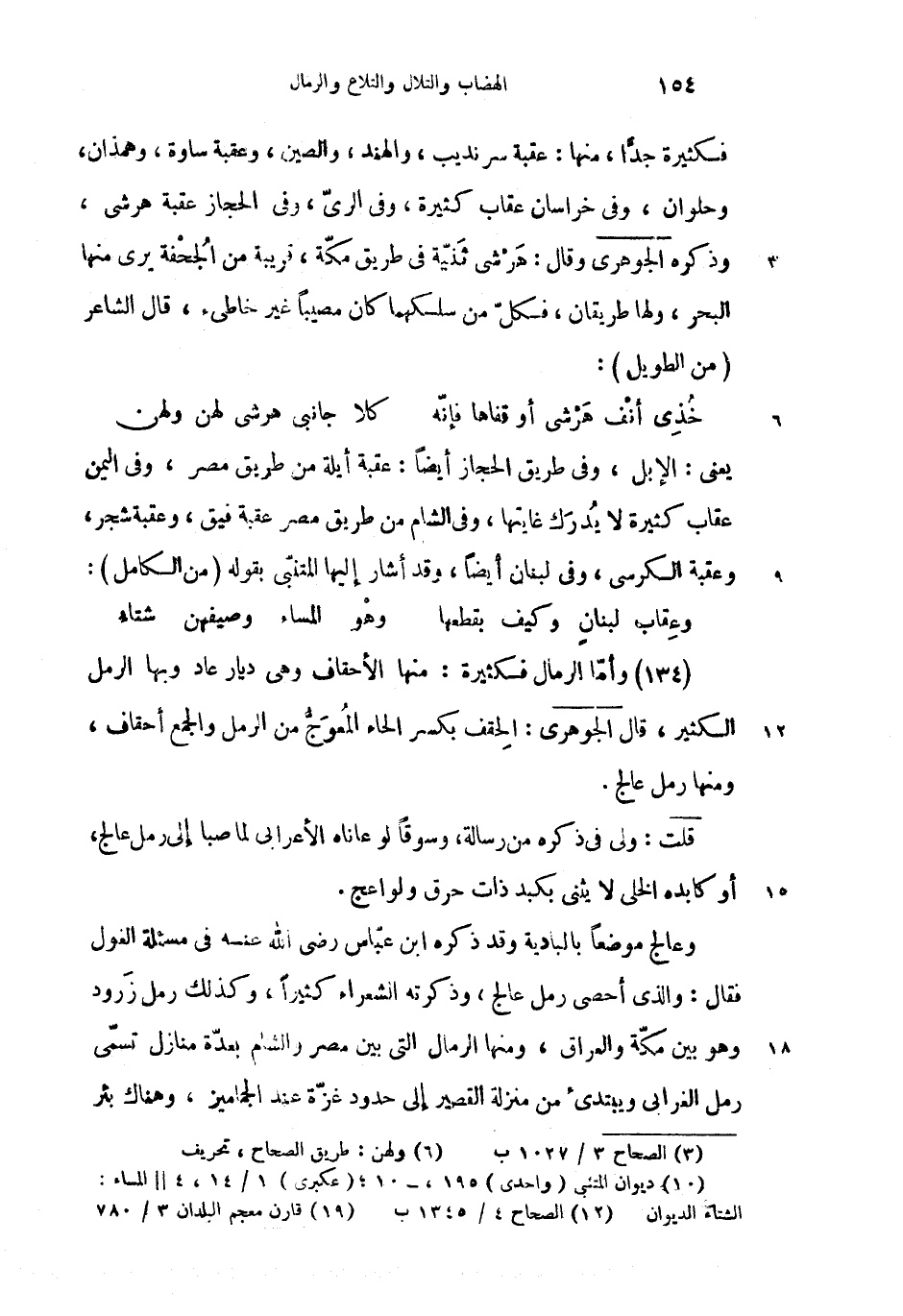 (134) وأمّا الرمال فكثيرة: منها الأحقاف وهى ديار عاد وبها الرمل الكثير، قال الجوهرى: (4) الحقف بكسر الحاء المعوجّ من الرمل والجمع أحقاف، ومنها رمل عالج.