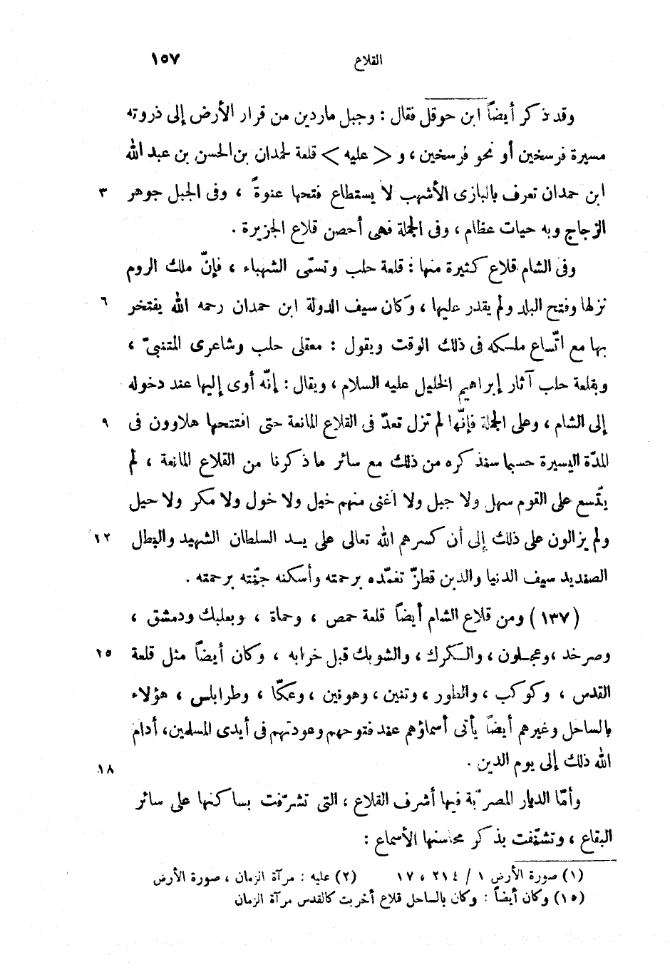 (137) ومن قلاع الشام أيضا قلعة حمص، وحماة، وبعلبك ودمشق، وصرخد، وعجلون، والكرك، والشوبك قبل خرابه، وكان أيضا (3) مثل قلعة القدس، وكوكب، والطور، وتنين، وهونين، وعكّا، وطرابلس، هؤلاء بالساحل وغيرهم أيضا يأتى أسماؤهم عند فتوحهم وعودتهم فى أيدى المسلمين، أدام الله ذلك إلى يوم الدين.