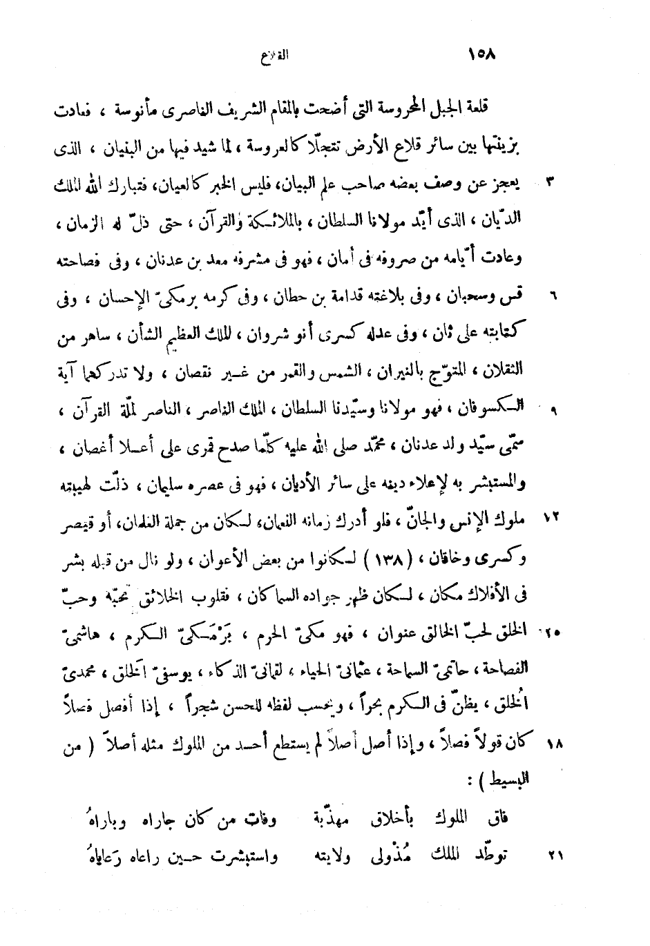 قلعة الجبل المحروسة التى أضحت بالمقام الشريف الناصرى مأنوسة، فعادت بزينتها بين سائر قلاع الأرض تتجلاّ كالعروسة، لما شيد فيها من البنيان، الذى يعجز عن وصف بعضه صاحب علم البيان، فليس الخبر كالعيان، فتبارك الله الملك الديّان، الذى أيّد مولانا السلطان، بالملائكة والقرآن، حتى ذلّ له الزمان، وعادت أيّامه من صروفه فى أمان، فهو فى مشرفه معد بن عدنان، وفى فصاحته قس وسحبان، وفى بلاغته قدامة بن حطان، وفى كرمه برمكىّ الإحسان، وفى كتابته على ثان، وفى عدله كسرى أنو شروان، الملك العظيم الشأن، ساهر من الثقلان، المتوّج بالنيران، الشمس والقمر من غير نقصان، ولا تدركهما آية الكسوفان، فهو مولانا وسيّدنا السلطان، الملك الناصر، الناصر لملّة القرآن، سمّى سيّد ولد عدنان، محمّد صلى الله عليه كلّما صدح قمرى على أعلا أغصان، والمستبشر به لإعلاء دينه على سائر الأديان، فهو فى عصره سليمان، ذلّت لهيبته ملوك الإنس والجانّ، فلو أدرك زمانه النعمان، لكان من جملة الغلمان، أو قيصر وكسرى وخاقان، (138) لكانوا من بعض الأعوان، ولو نال من قبله بشر فى الأفلاك مكان، لكان ظهر جواده السماكان، فقلوب الخلائق تحبّه وحبّ الخلق لحبّ الخالق عنوان، فهو مكىّ الحرم، برمكىّ الكرم، هاشمىّ الفصاحة، حاتمىّ السماحة، عثمانىّ الحياء، لقمانىّ الذكاء، يوسفىّ الخلق، محمدىّ الخلق، يظنّ فى الكرم بحرا، ويحسب لفظه للحسن شجرا، إذا أفصل فصلا كان قولا فصلا، وإذا أصل أصلا لم يستطع أحد من الملوك مثله أصلا (من البسيط):