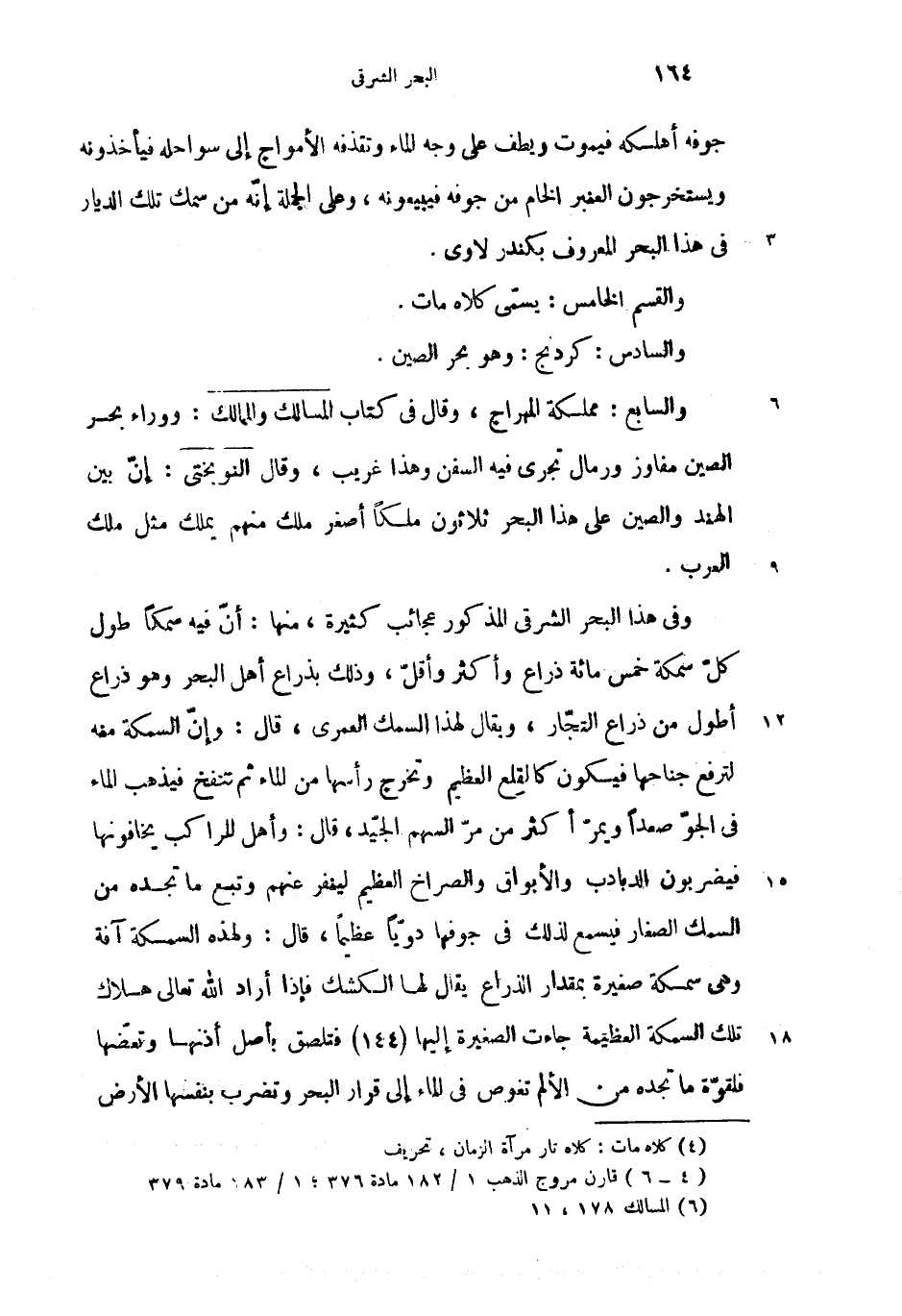 وفى هذا البحر الشرقى المذكور عجائب كثيرة، منها: أنّ فيه سمكا طول كلّ سمكة خمس مائة ذراع وأكثر وأقلّ، وذلك بذراع أهل لبحر وهو ذراع أطول من ذراع التجّار، ويقال لهذا السمك العمرى، قال: وإنّ السمكة منه لترفع جناحها فيكون كالقلع العظيم وتخرج رأسها من الماء ثم تنفخ فيذهب الماء فى الجوّ صعدا ويمرّ أكثر من مرّ السهم الجيّد، قال: وأهل المراكب يخافونها فيضربون الدبادب والأبواق والصراخ العظيم لينفر عنهم وتبع ما تجده من السمك الصغار فيسمع لذلك فى جوفها دويّا عظيما، قال: ولهذه السمكة آفة وهى سمكة صغيرة بمقدار الذراع يقال لها الكشك فإذا أراد الله تعالى هلاك تلك السمكة العظيمة جاءت الصغيرة إليها (144) فتلصق بأصل أذنها وتعضّها فلقوّة ما تجده من الألم تغوص فى الماء إلى قرار البحر وتضرب بنفسها الأرض